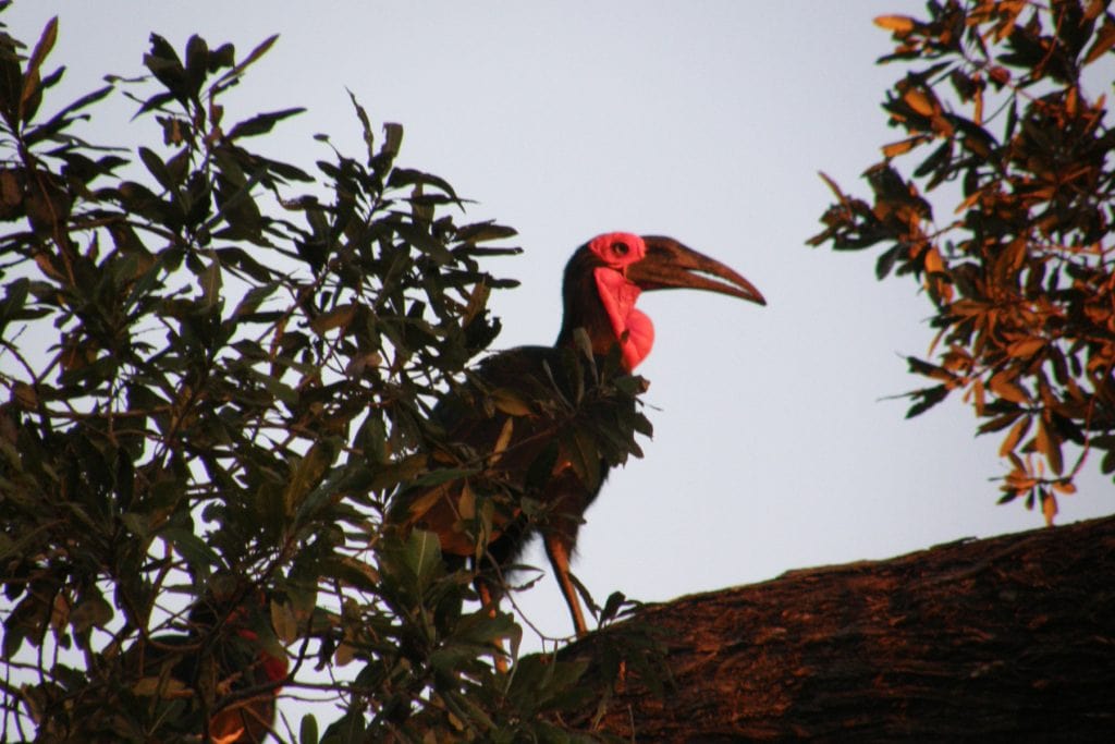 “On our discovery tour to the reserve, we walked in the Northern part of tall grassland and thickets. There are comfortable walking paths and nice views over small valleys and fields. In the beginning of the walk, we could hear a call of a coucal, but the bird itself is hiding in the bushes. Several yellow bishops (Euplectes capensis crassirostris) and Common bulbuls (Pycnonotus barbatus) fly around. Then, we spot a Broad-billed roller (Eurystomus glaucurus) sitting quietly among tree branches. My favourite sightings during our walk are four Crowned hornbills (Tockus alboterminatus) and a Striped Kingfisher (Halcyon c. chelicuti).”